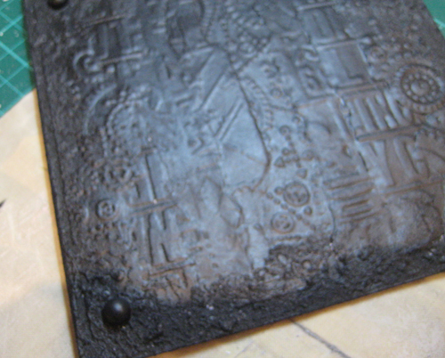 I started with greyboard and using mod podge to layer lots of torn strips of embossed card stock. I then added Deco Art sand texture paste to the edges and some pearls in the corners. Once dry I covered it all in black acrylic. Again after fully drying, I dry brushed gesso over the surface.